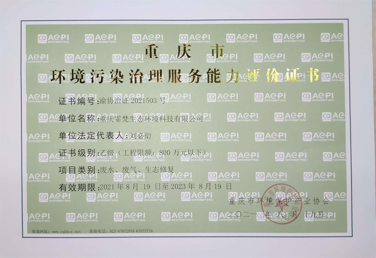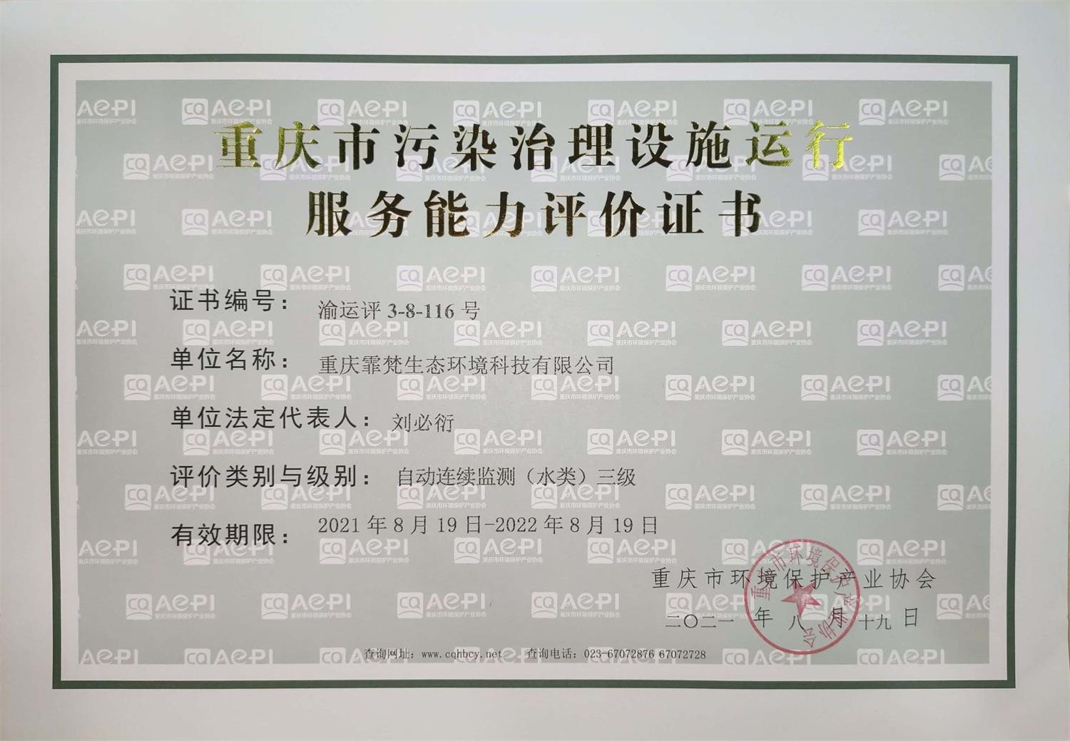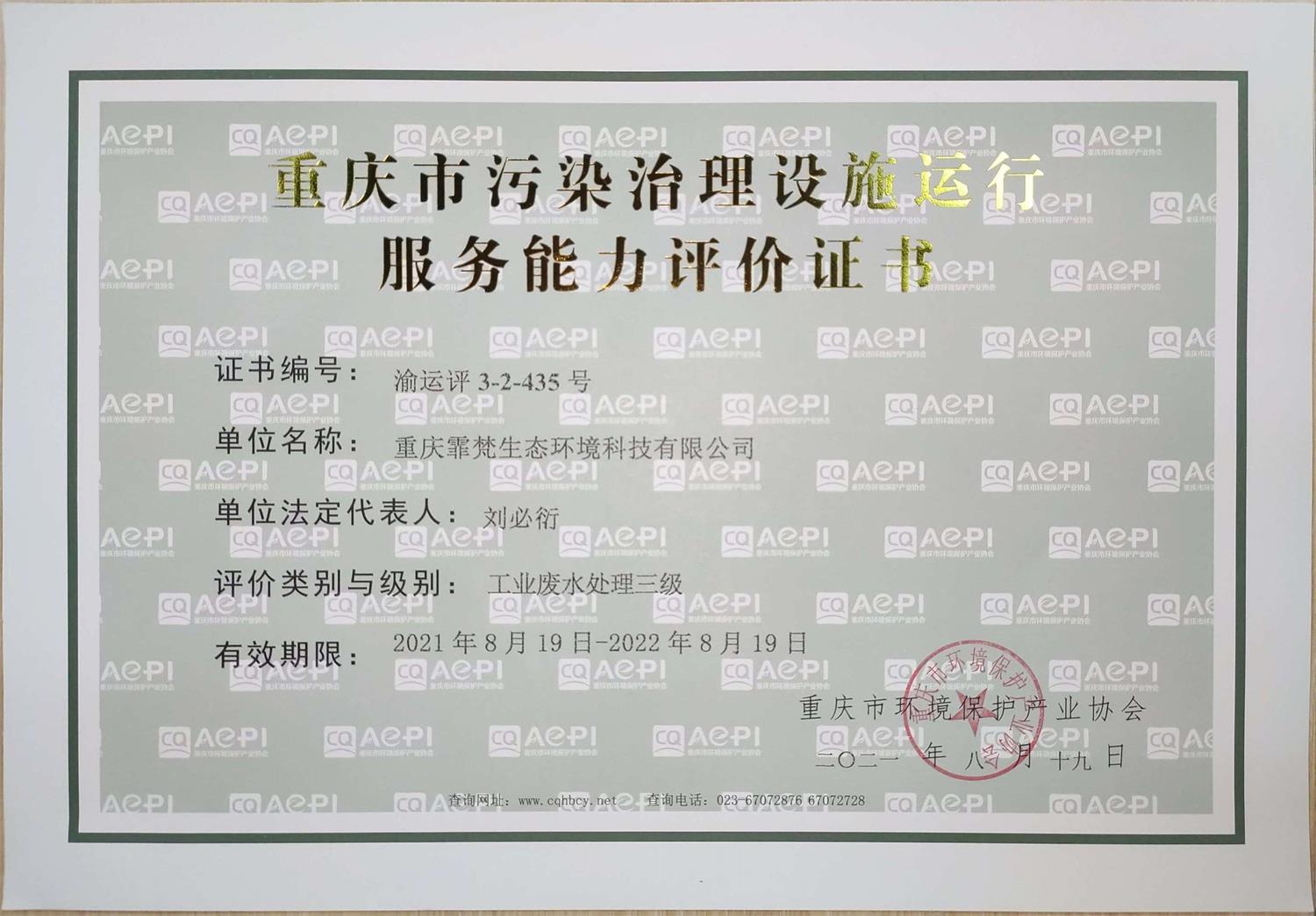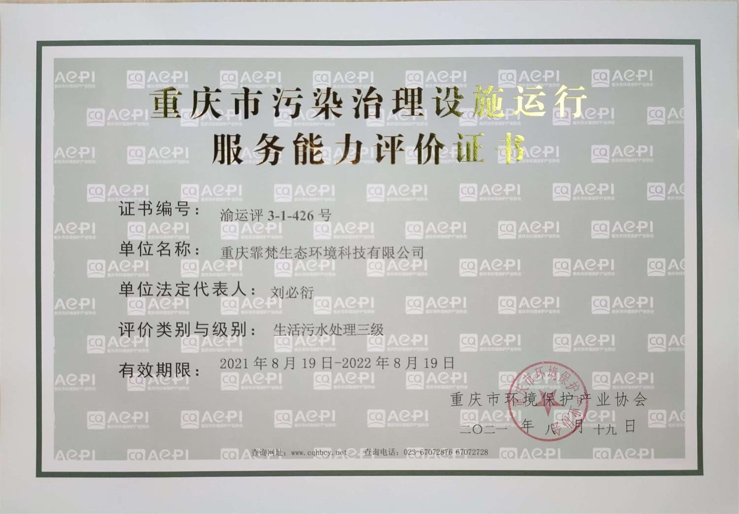 热烈祝贺霏洋环保旗下子公司重庆霏梵生态环境科技有限公司,一次性通过重庆市环境保护产业协会的专家评审,再添4项环保新资质!此次新增资质包括:《环境污染治理能力评价乙级证书》(废水、废气、生态修复专项)、《重庆市污染治理设施运行服务能力评价证书》(包括:工业废水处理三级、生活废水处理三级、自动连续监测【水类】三级专项)。